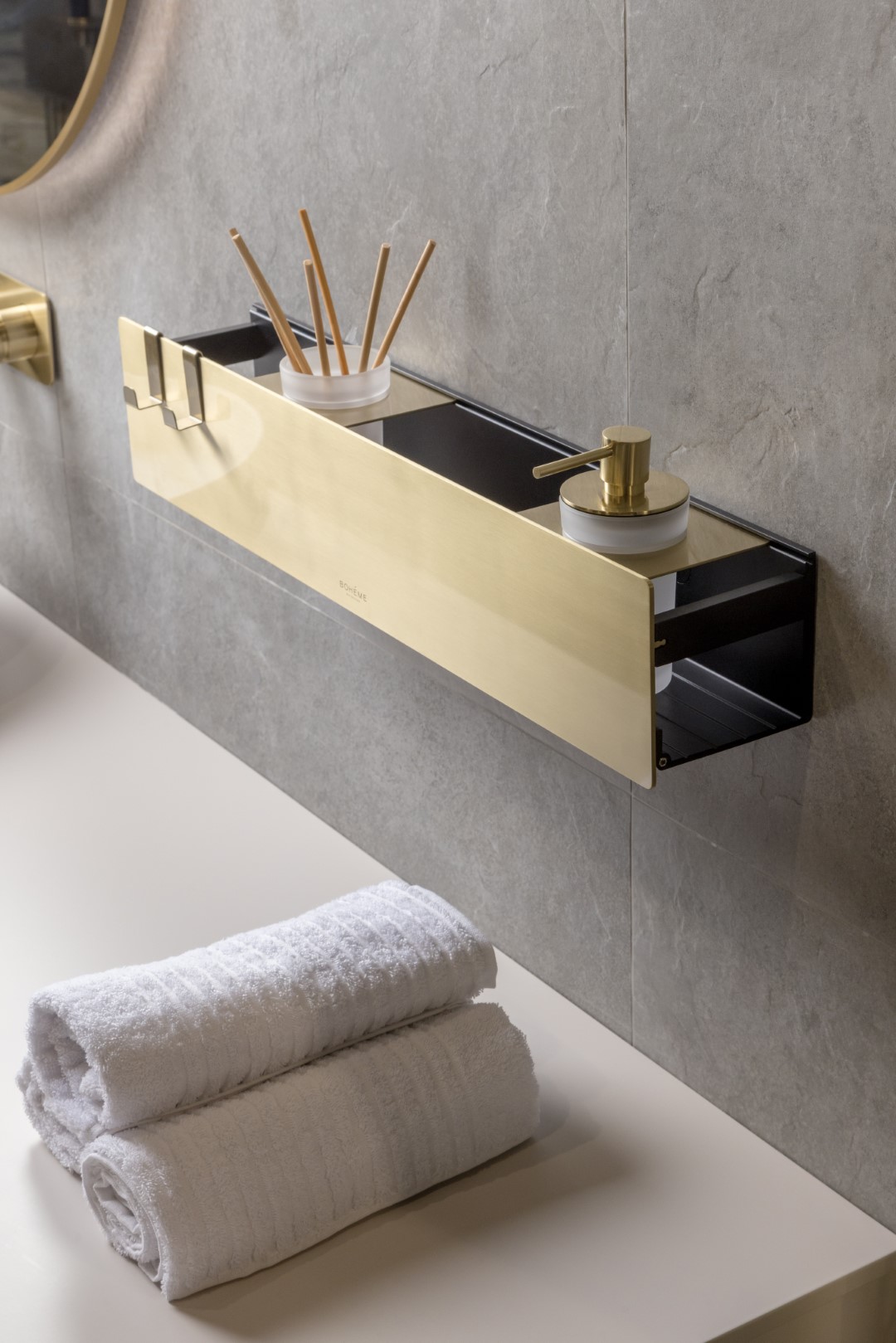 Абсолютно новая полка Boheme Space. Ширина 60см, оптимальный объем хранения, возможность дополнения съемными аксессуарами, нержавеющая сталь и полная влагостойкость. Возможность использования в мокрых и сухих зонах.