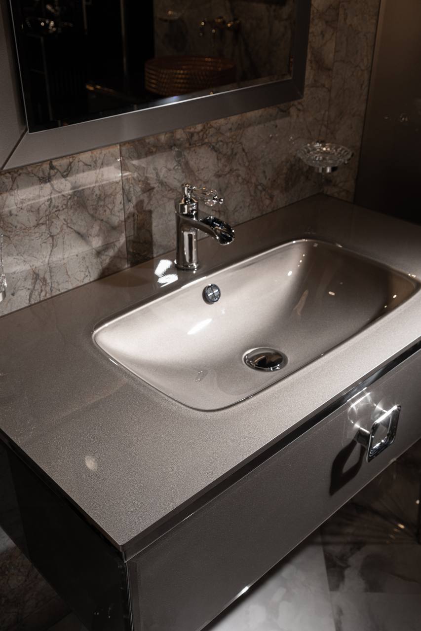 Эксклюзивные ручки, произведенные итальянскими мастерами, сдержаны и элегантны. Выдвижные ящики практичны и обладают хорошей ёмкостью. Топовая фурнитура с плавным закрытием от Hettich. Ну и конечно, фирменная отделка дна ящиков и пенала экокожей. Клиент может выбрать как раковины-моноблок, так и столешницы с эксклюзивными накладными чашами.