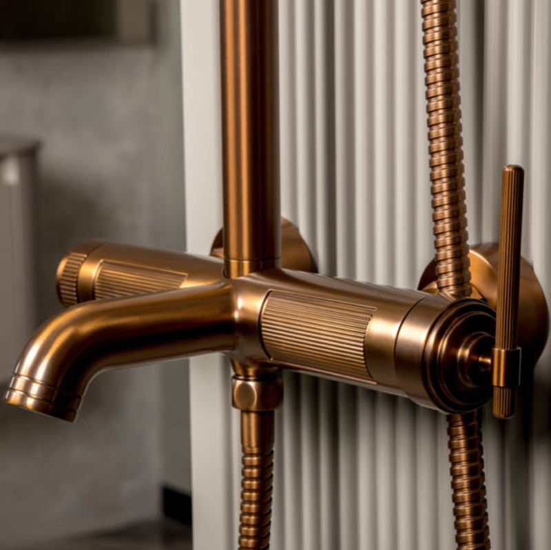 Благородная палитра «Этерна» — нержавеющая сталь и брашированная медь, которая наносится на изделия по технологии вакуумного напыления. В каждом из двух цветов предложены смесители для установки на стену, раковину, столешницу и биде, а также имеется душевой комплект скрытого монтажа.