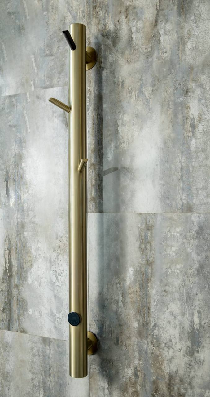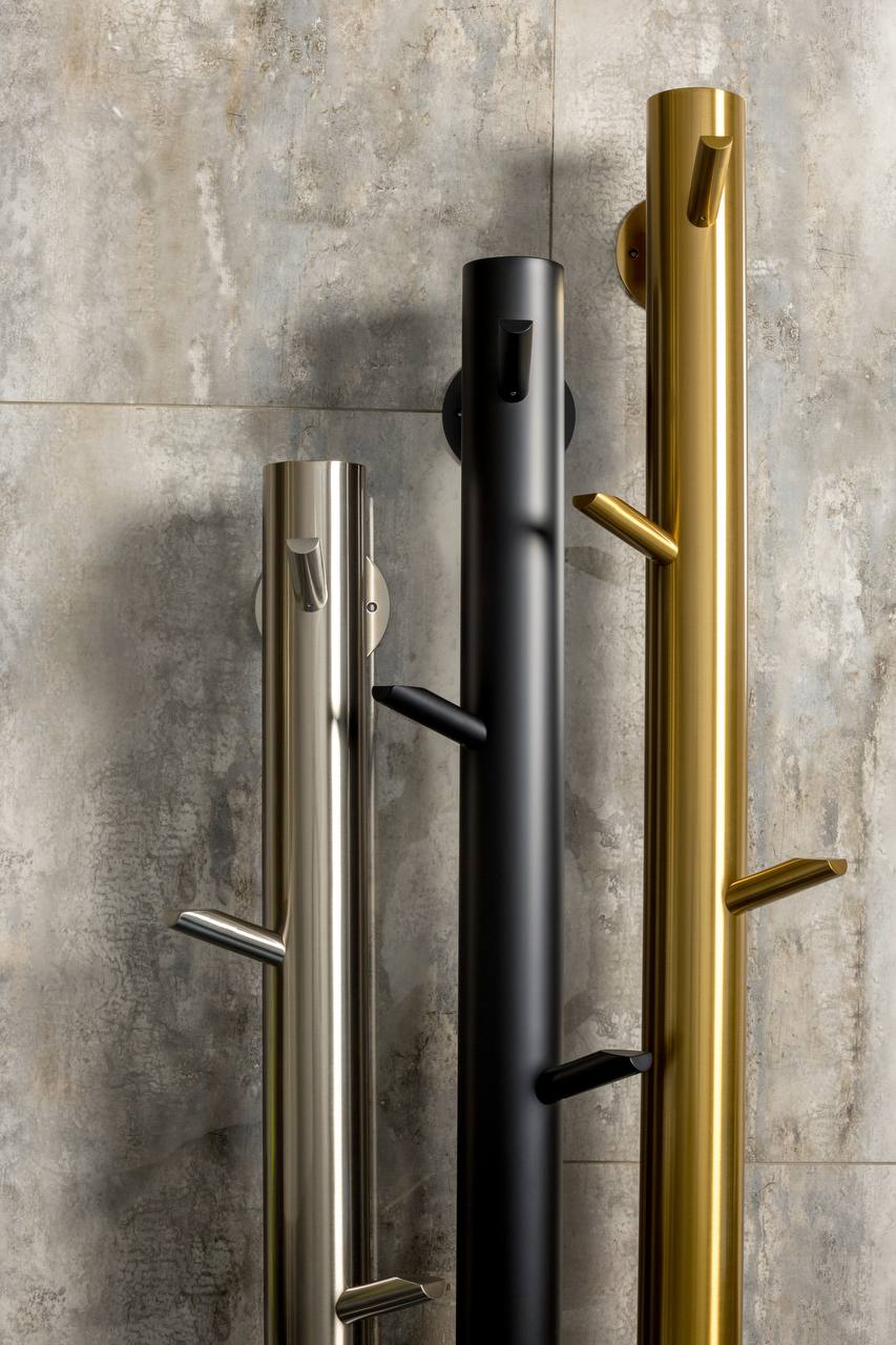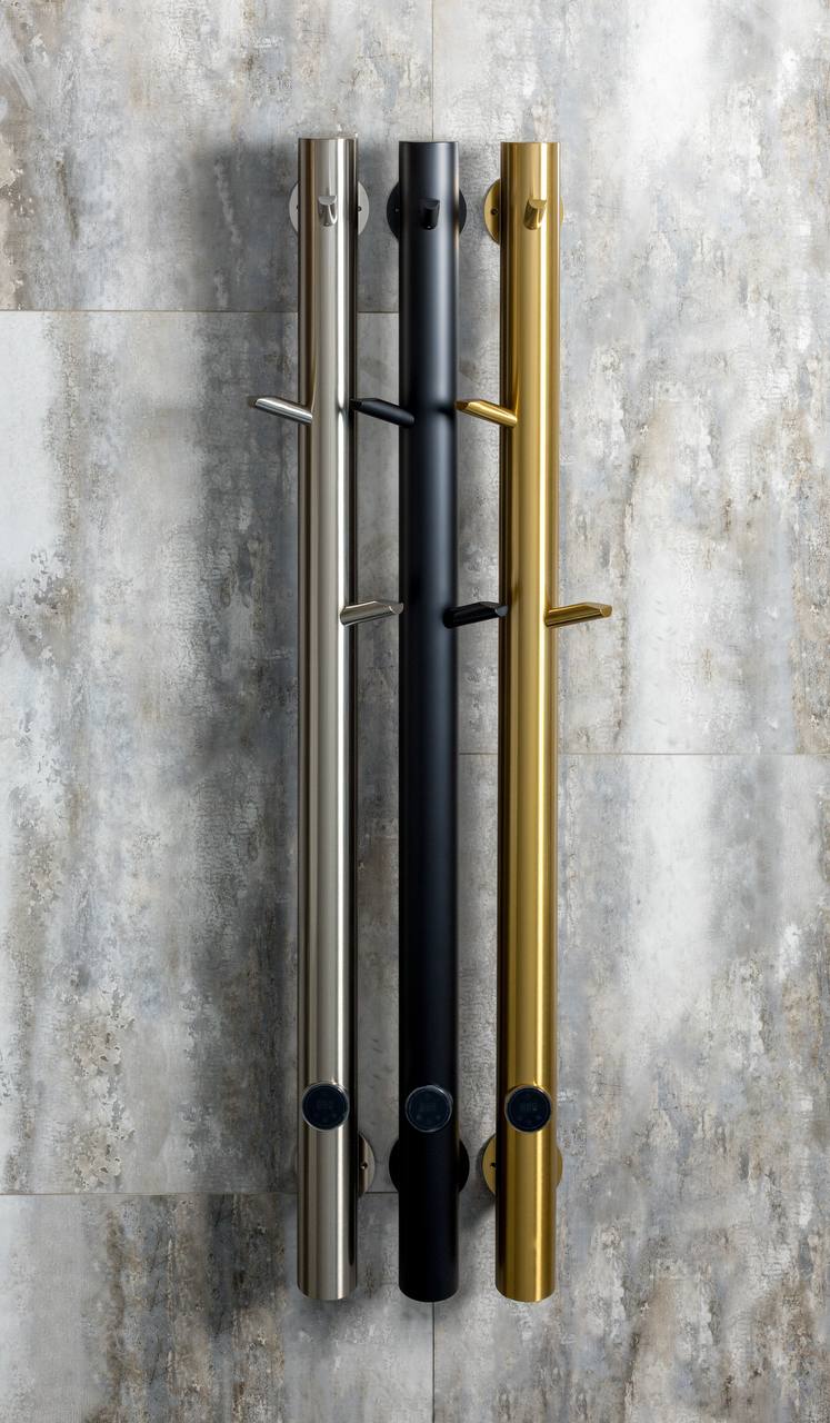 Новый дизайнерский полотенцесушитель-радиатор BOHEME Oak. Минималистичный дизайн, скрытое подключение, встроенное сенсорное управление с возможностью регулировки температуры и времени работы. Электрический сухой тэн исключает любые протечки. Девять цветовых решений. Удобные крючки позволяют повесить до трех предметов. Высота 150см, диаметр 8см.