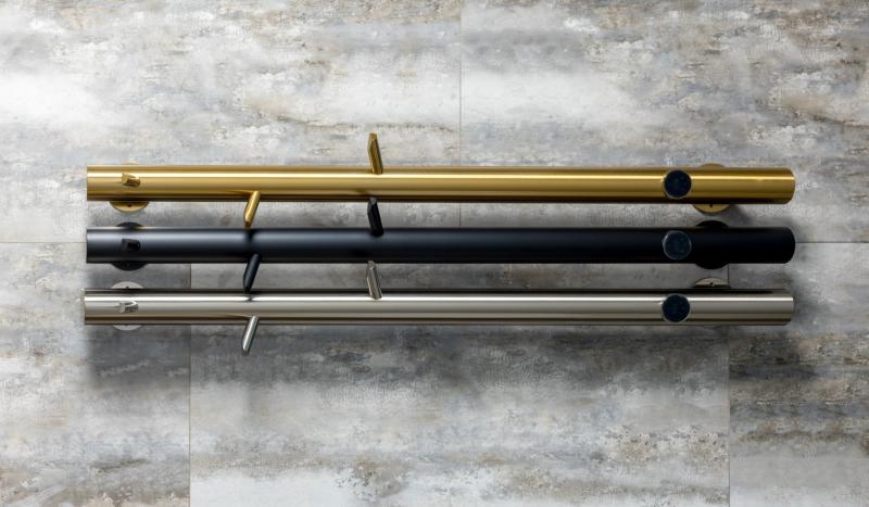 Новый дизайнерский полотенцесушитель-радиатор BOHEME Oak. Минималистичный дизайн, скрытое подключение, встроенное сенсорное управление с возможностью регулировки температуры и времени работы. Электрический сухой тэн исключает любые протечки. Девять цветовых решений. Удобные крючки позволяют повесить до трех предметов. Высота 150см, диаметр 8см.